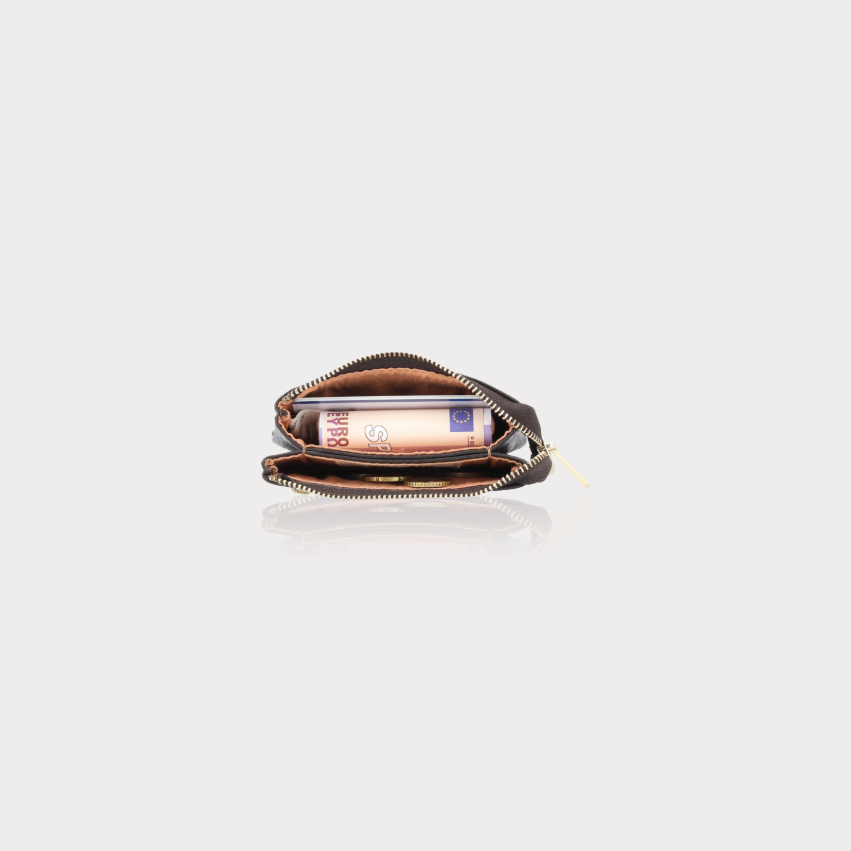 De PETITE CAMILLE Chocolate Torte Gold is een compacte portemonnee in een rijke chocoladetint. Ondanks zijn kleine afmetingen biedt hij ruimte voor drie pasvakjes en een extern ritsvakje voor muntgeld. Elegant, stevig en handig.