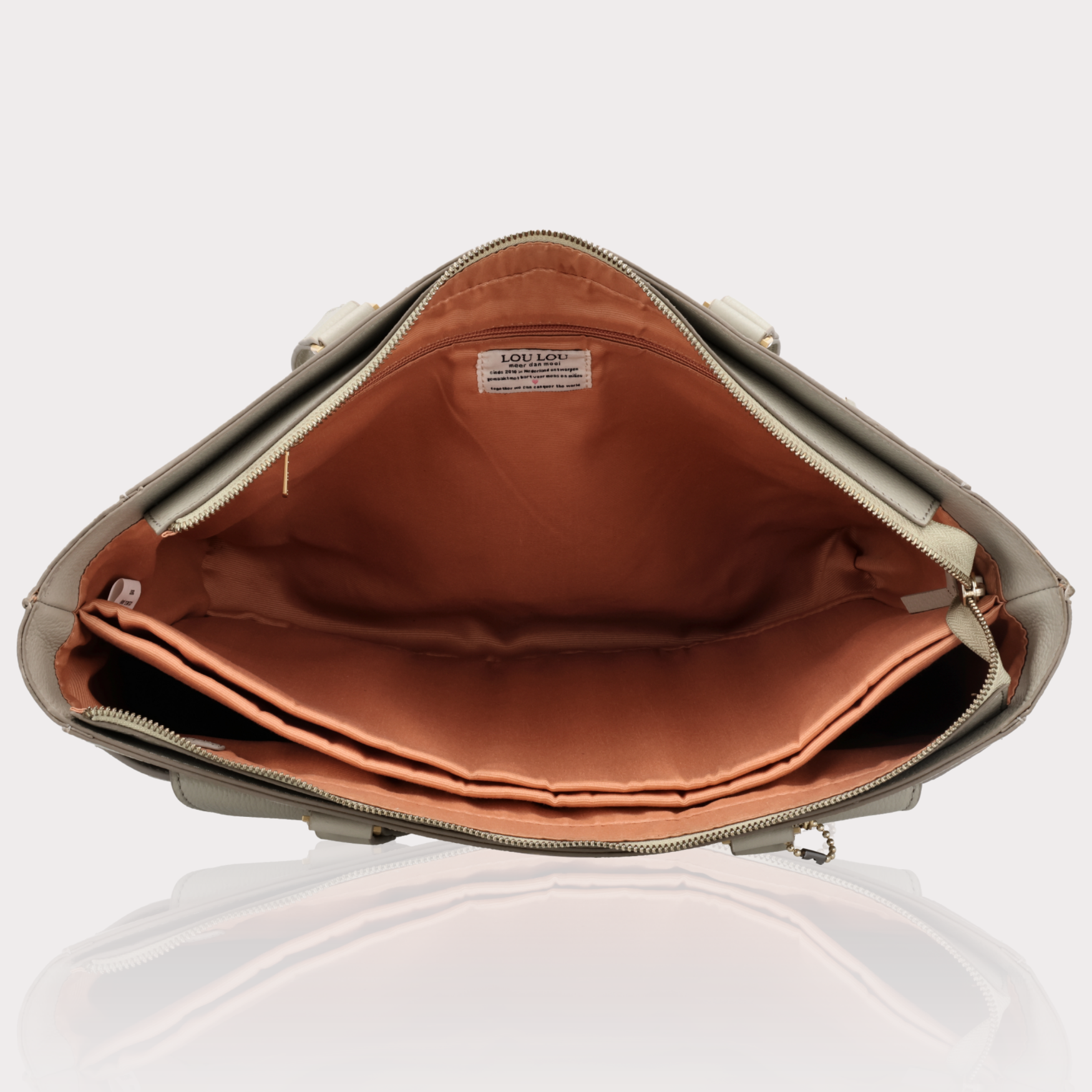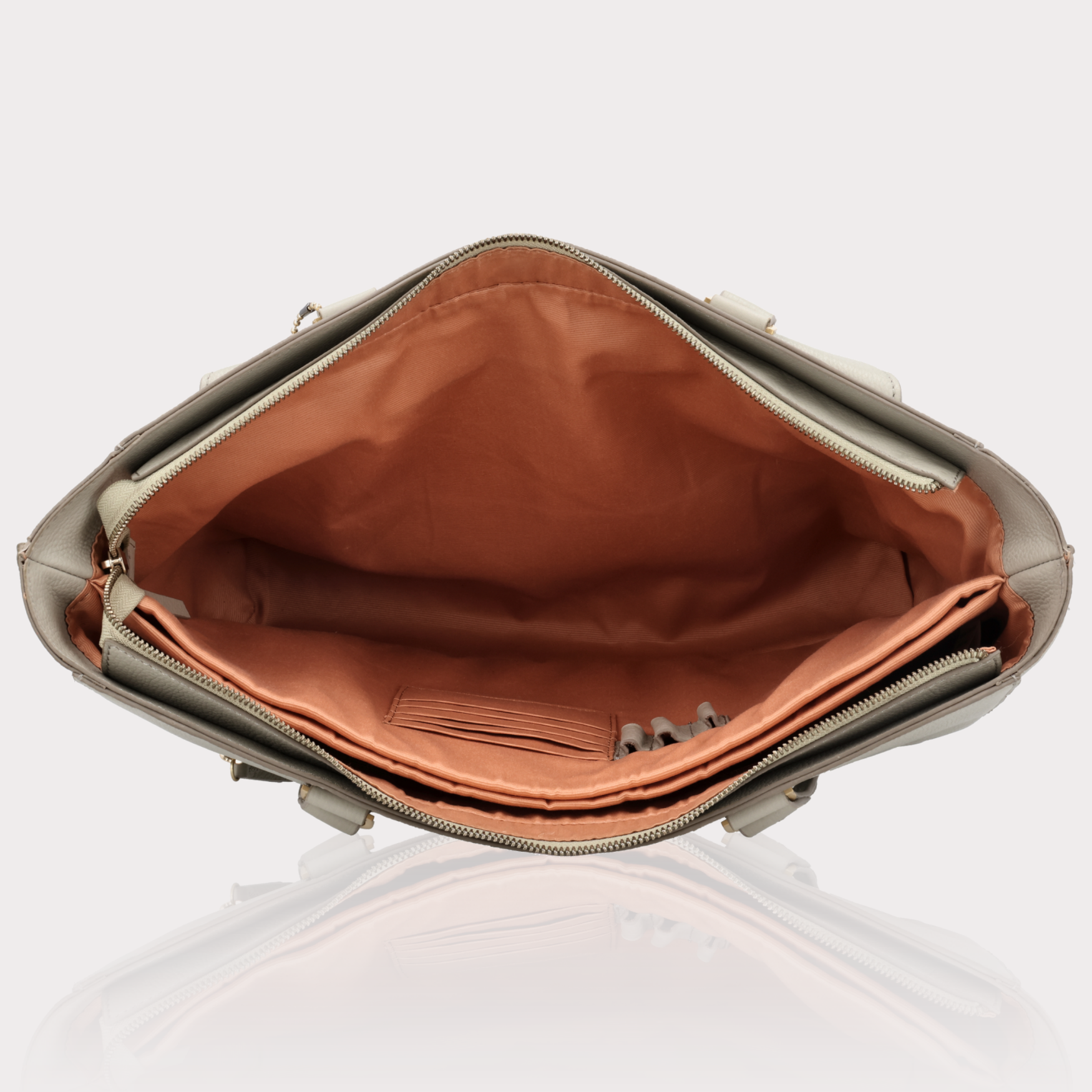 De CELINE Fog Gold is een minimalistische en elegante laptoptas in zachte grijstint. Dankzij het luxe grain leer, goudkleurige accenten en roze voering is deze tas een eyecatcher op kantoor. De tas biedt ruimte voor een 15.6 inch laptop, heeft diverse opbergvakken en een comfortabele schouderband voor veelzijdig gebruik.