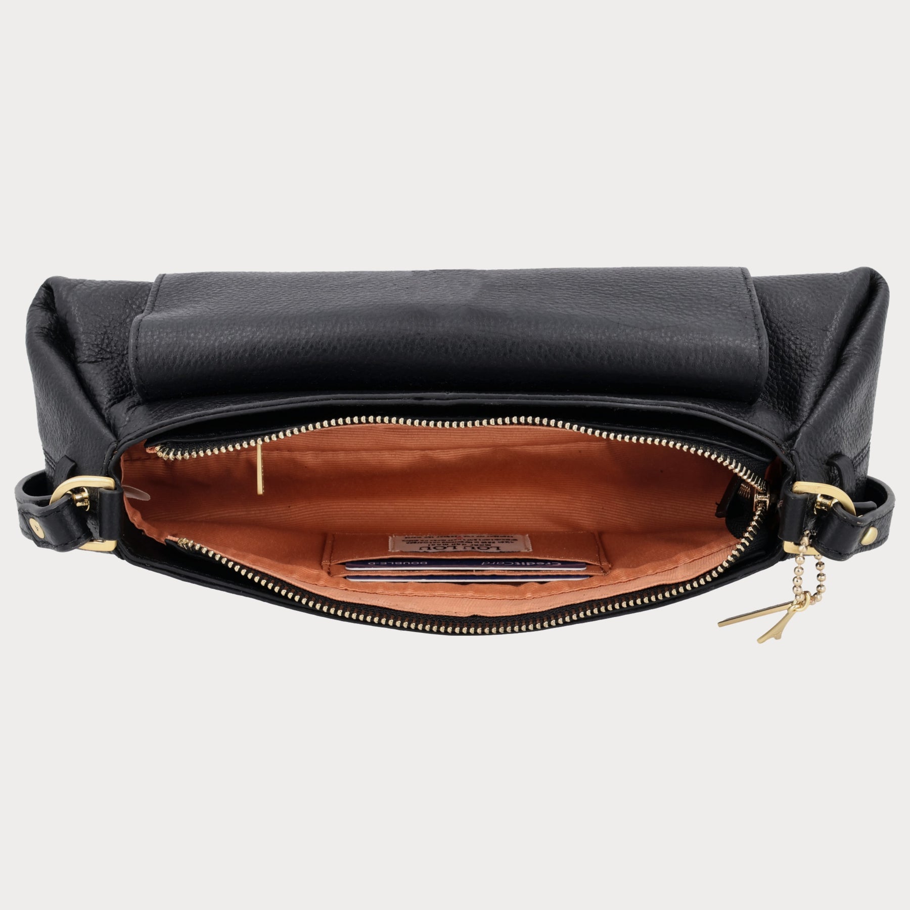 De ISA Black Gold is een casual-chique overslagtas in zwart grain leer, ontworpen om elegantie en functionaliteit te combineren. Door het overslagmodel met magneetsluiting oogt de tas slank, maar binnenin vind je voldoende ruimte, slimme vakindeling én een verstelbare schouderband zodat je haar ook crossbody kunt dragen.