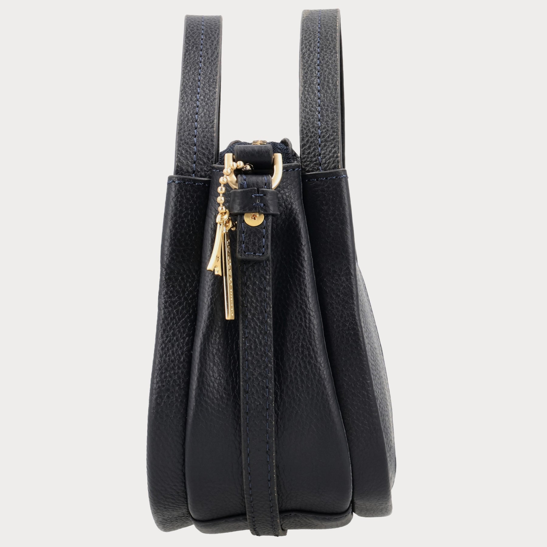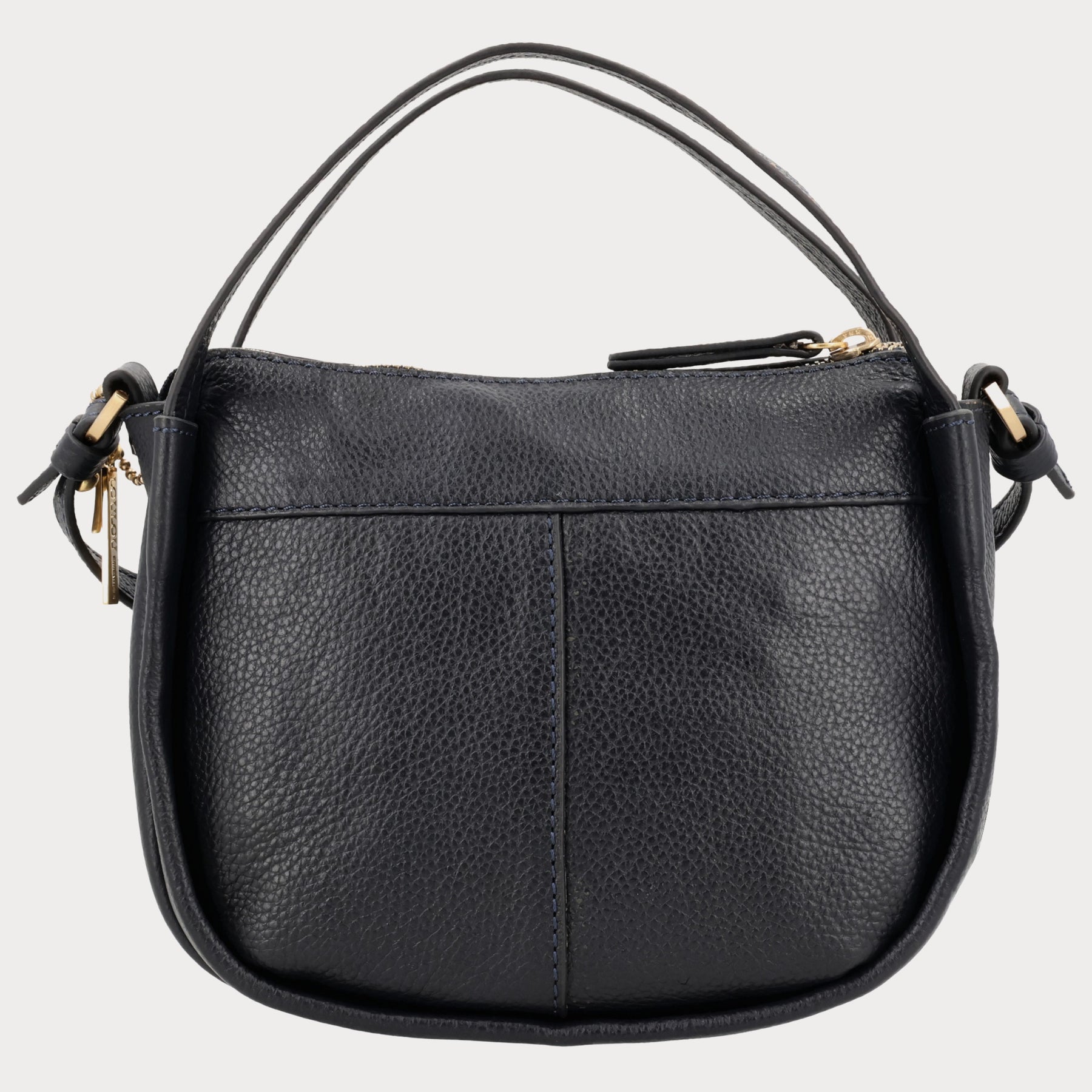 • Donkerblauw Grain leer met matte goudkleurige hardware