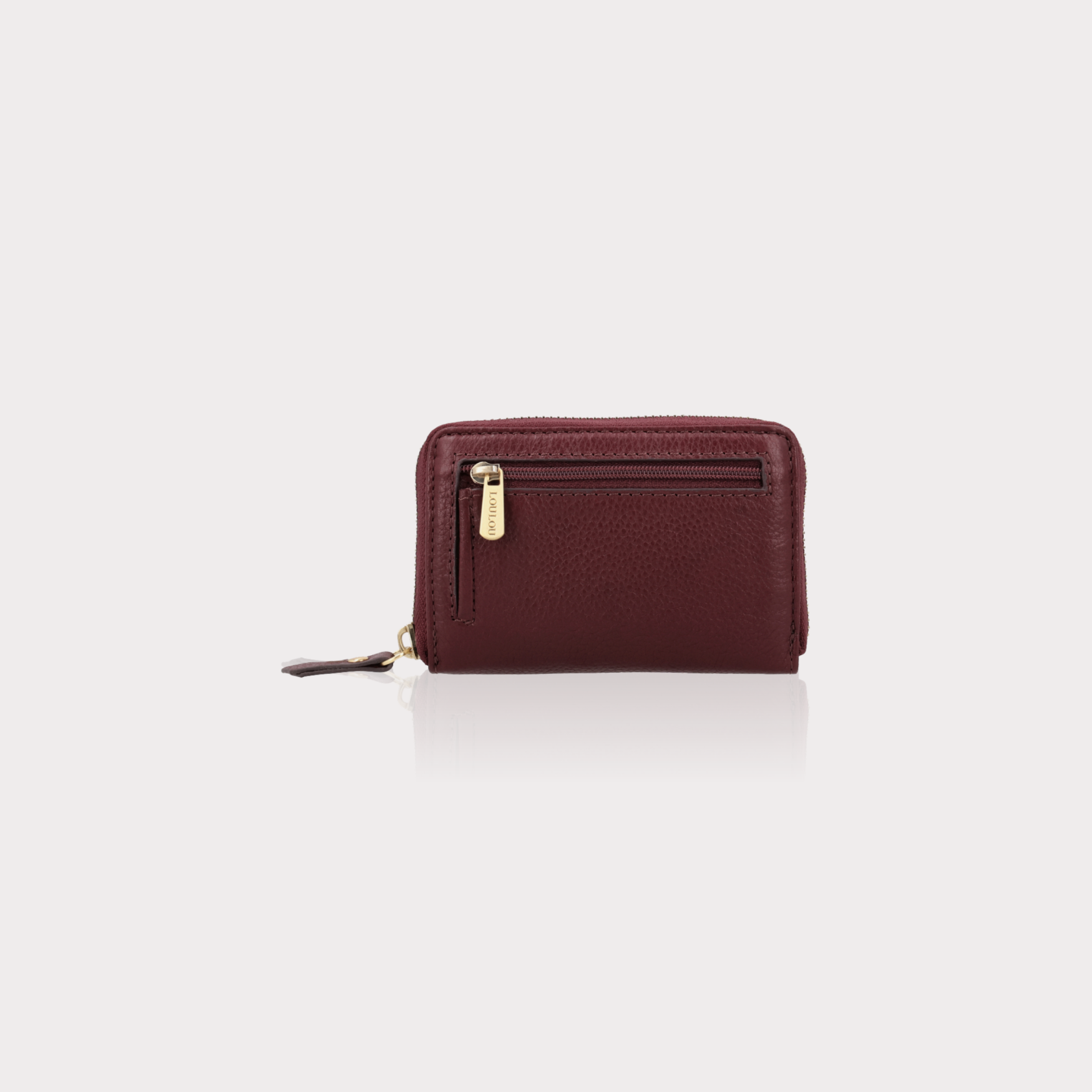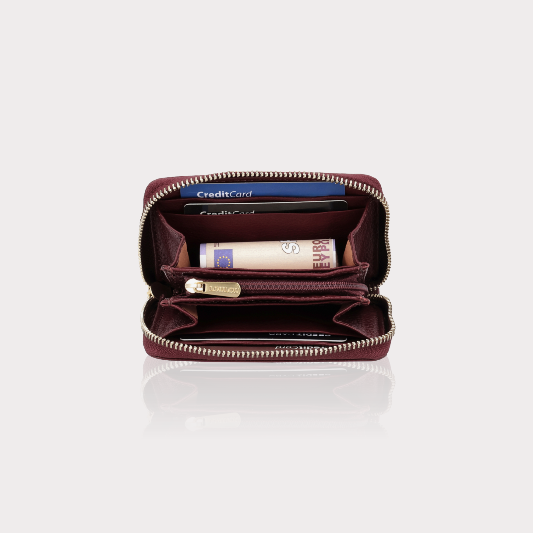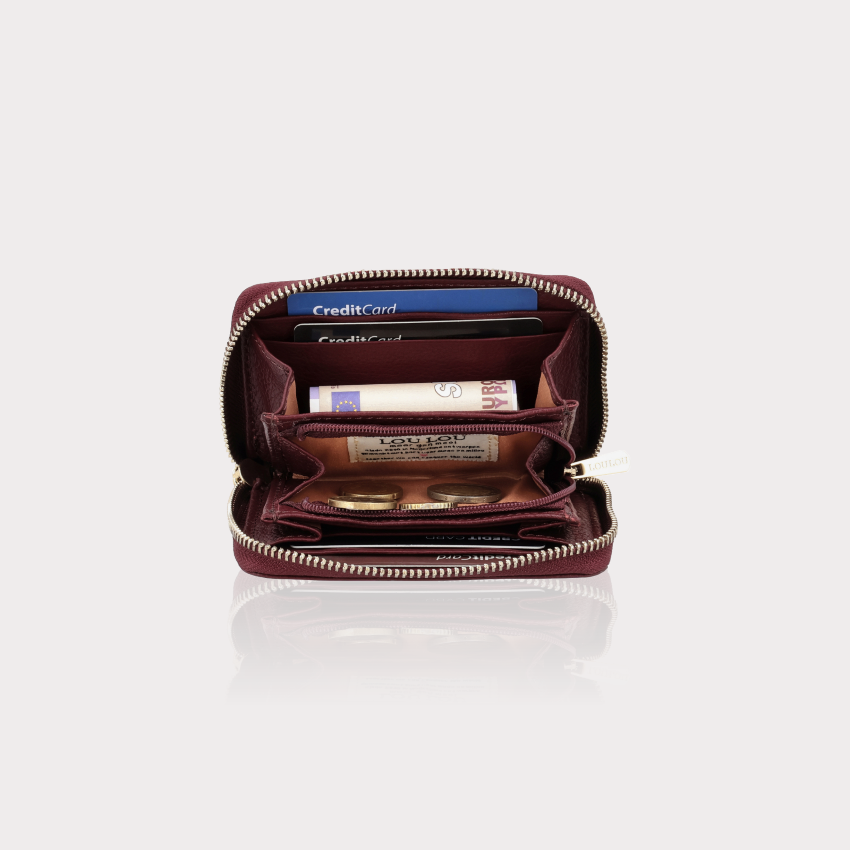 De PETITE EMILIE Ruby Gold valt op door zijn robijnrode kleur en compacte vorm. Ondanks het kleine formaat biedt hij ruimte voor vier creditcardvakjes, een fotovakje, een muntvakje én een extra vak voor briefgeld. Compactie en functionaliteit in één elegant ontwerp.