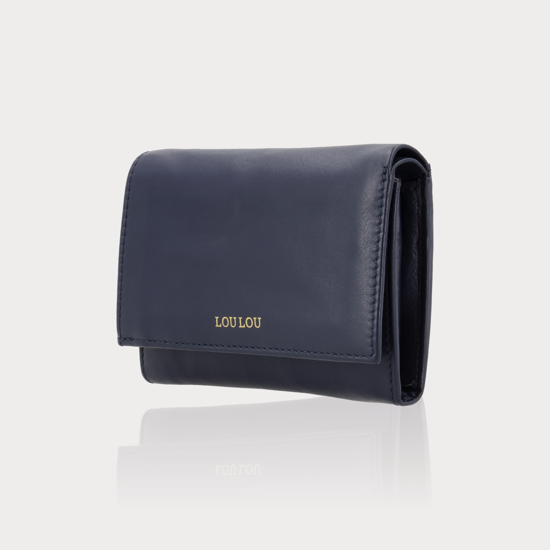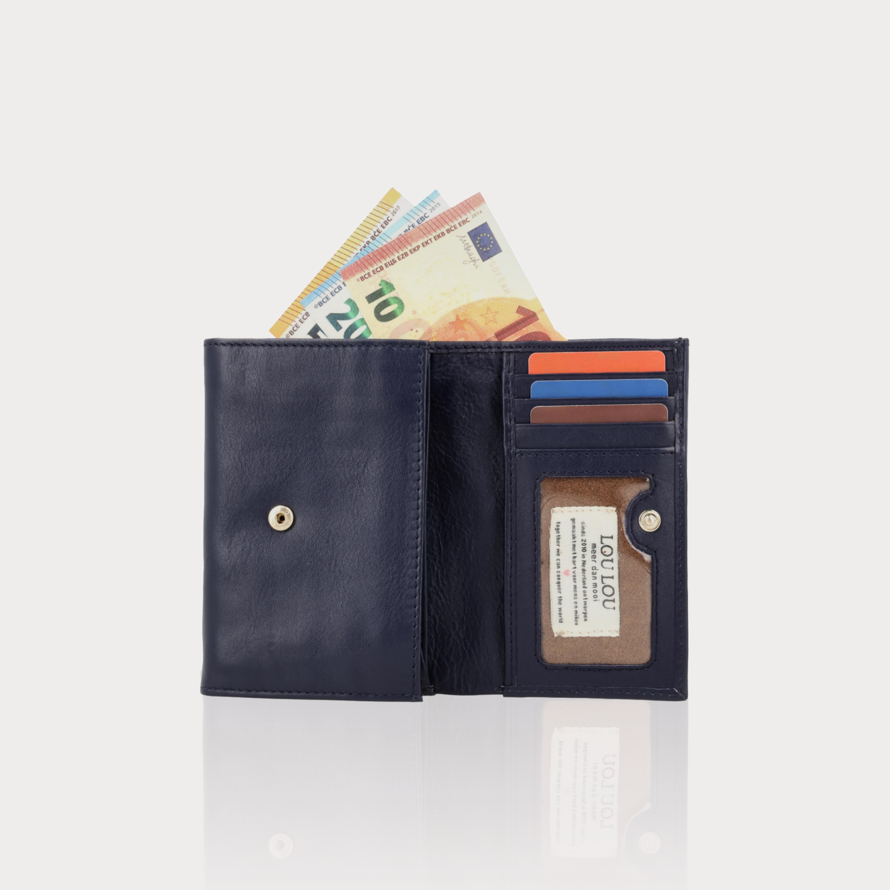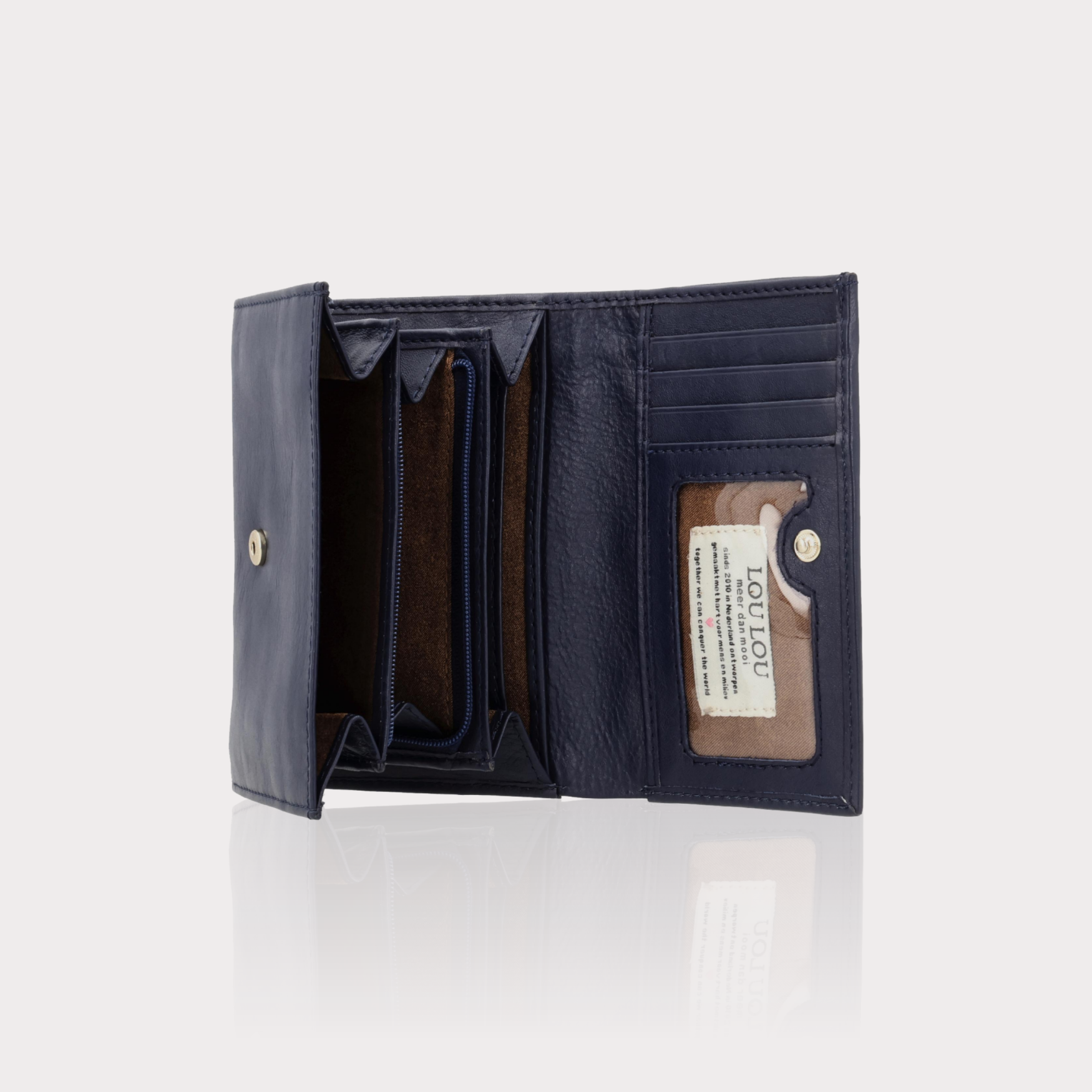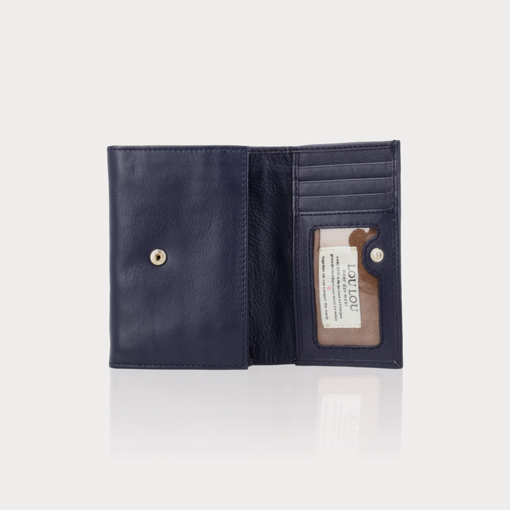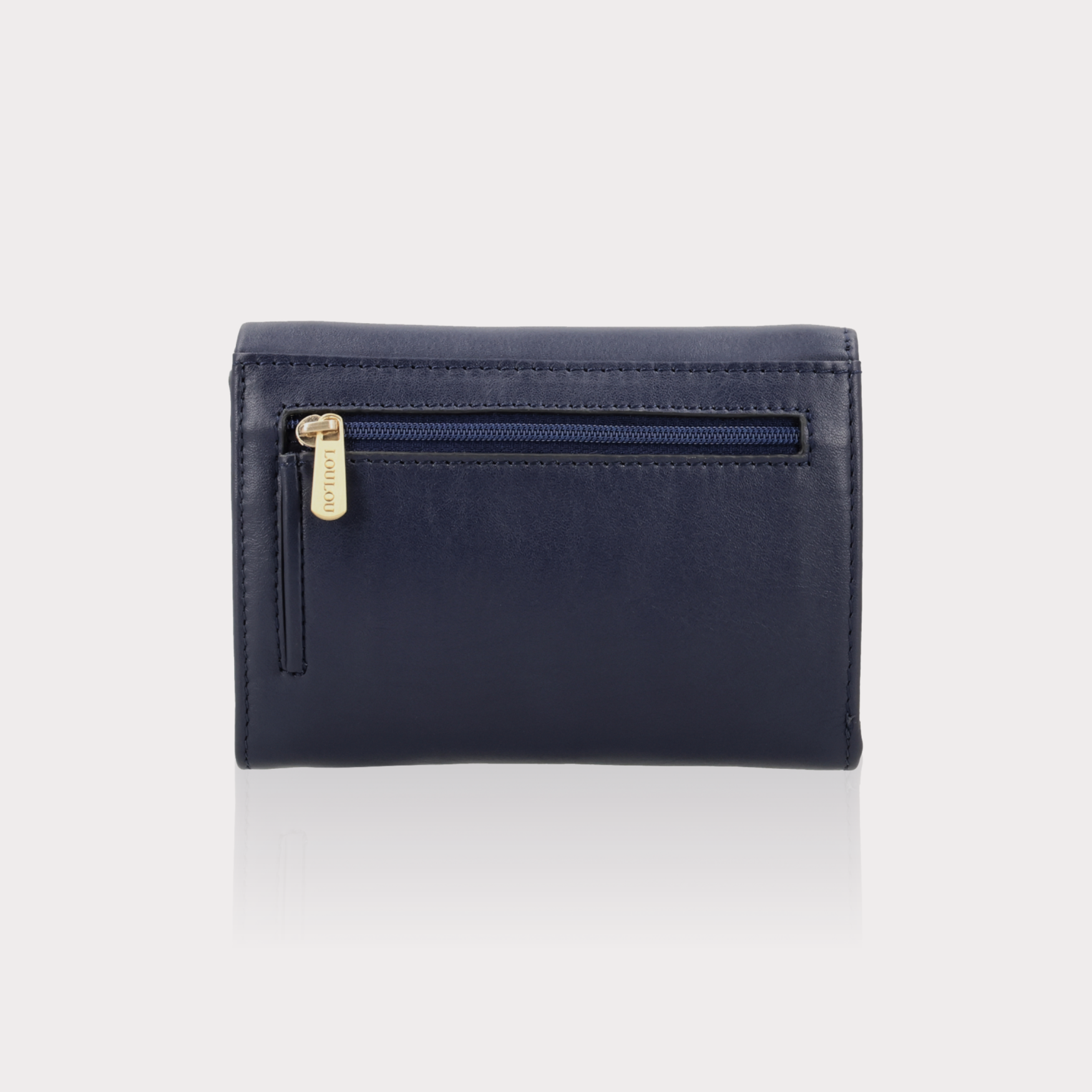 De PETITE FLEUR Classic Blue Gold is een compacte portemonnee in blauw classic leer. Ondanks zijn kleine formaat biedt hij ruimte voor meerdere pasvakjes, een ritsvak voor muntgeld, en extra vakken voor briefgeld of bonnen. Elegant én functioneel.