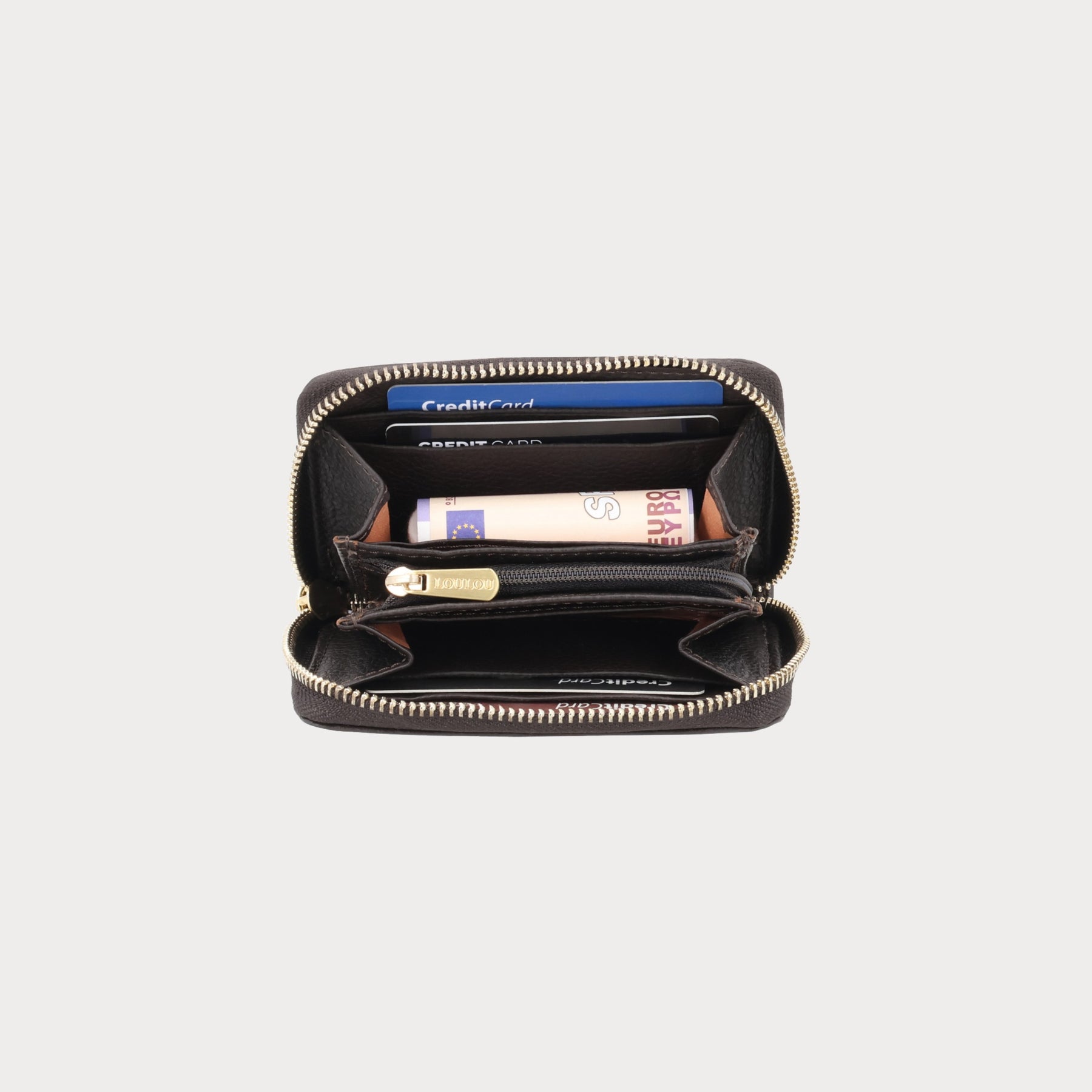 De PETITE EMILIE Chocolate Torte Gold is uitgevoerd in een prachtige warme bruine kleur. Ondanks het compacte formaat beschikt het model over vier creditcardvakjes, een fotovakje, een muntvakje en een extra vak voor briefgeld. Stijlvol én functioneel.