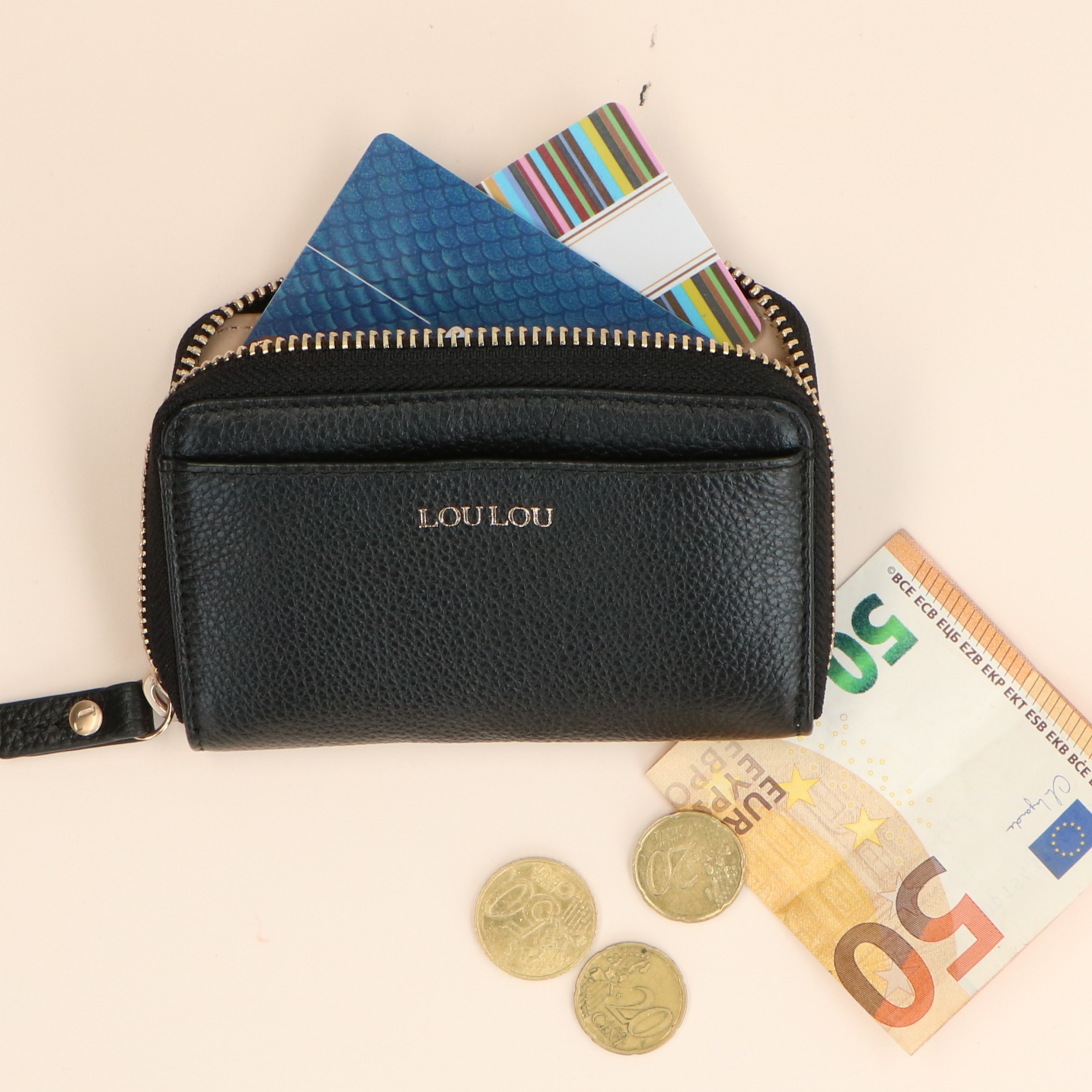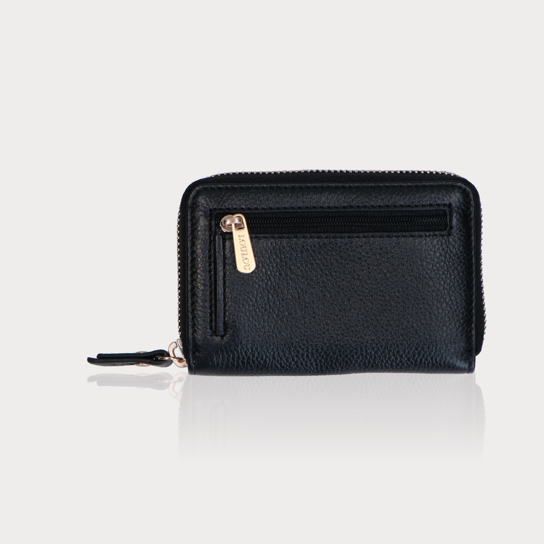 De PETITE EMILIE Black Gold is een compacte portemonnee ontworpen om zelfs in kleine tasjes of clutches te passen. Ondanks het kleine formaat biedt hij ruimte voor vier creditcardvakjes, een fotovakje, een ritsvakje voor muntgeld én een extra vakje voor briefgeld. De klassieke zwarte uitvoering geeft hem een elegante uitstraling.