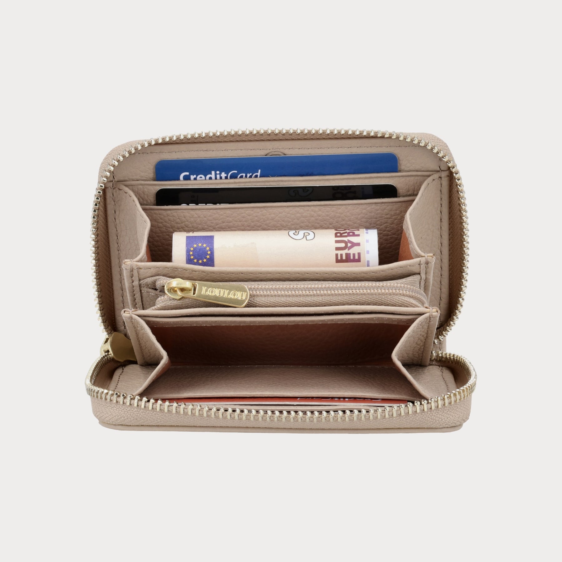De PETITE EMILIE Cashmere Gold combineert functionaliteit en elegantie in een lichte beigeroze tint. Deze kleine portemonnee biedt ruimte aan vier kaartvakjes, een fotovakje, een ritsvakje voor muntgeld en een extra vak voor briefgeld. Compact en stijlvol.