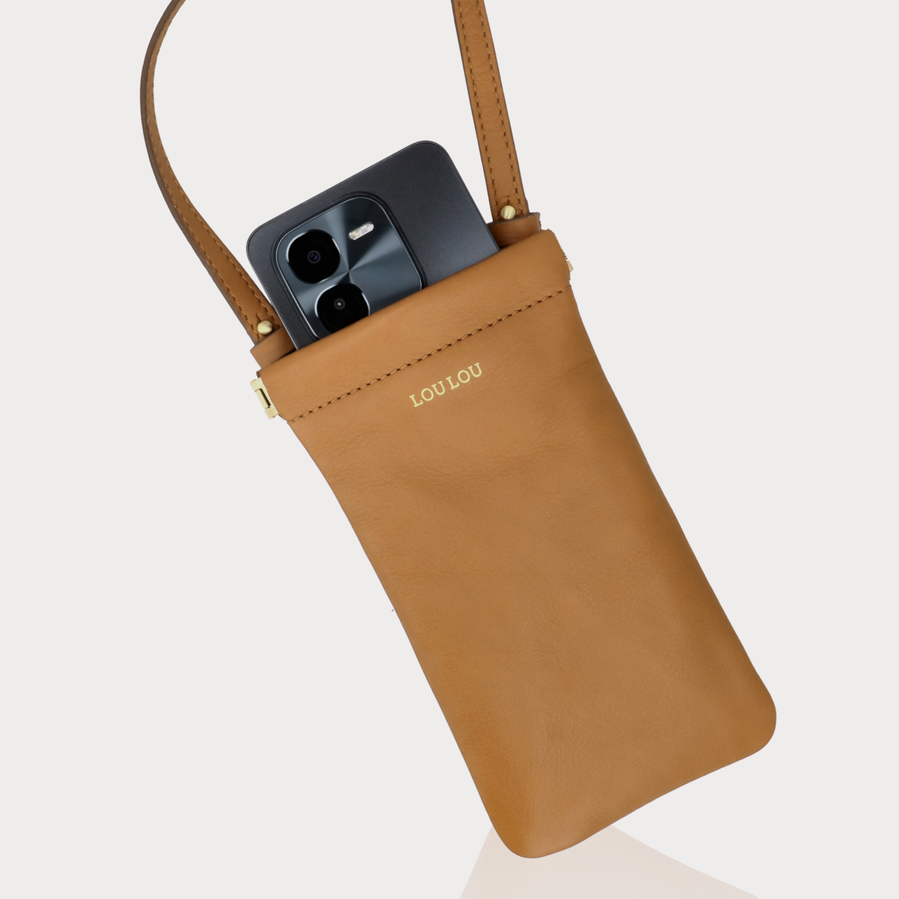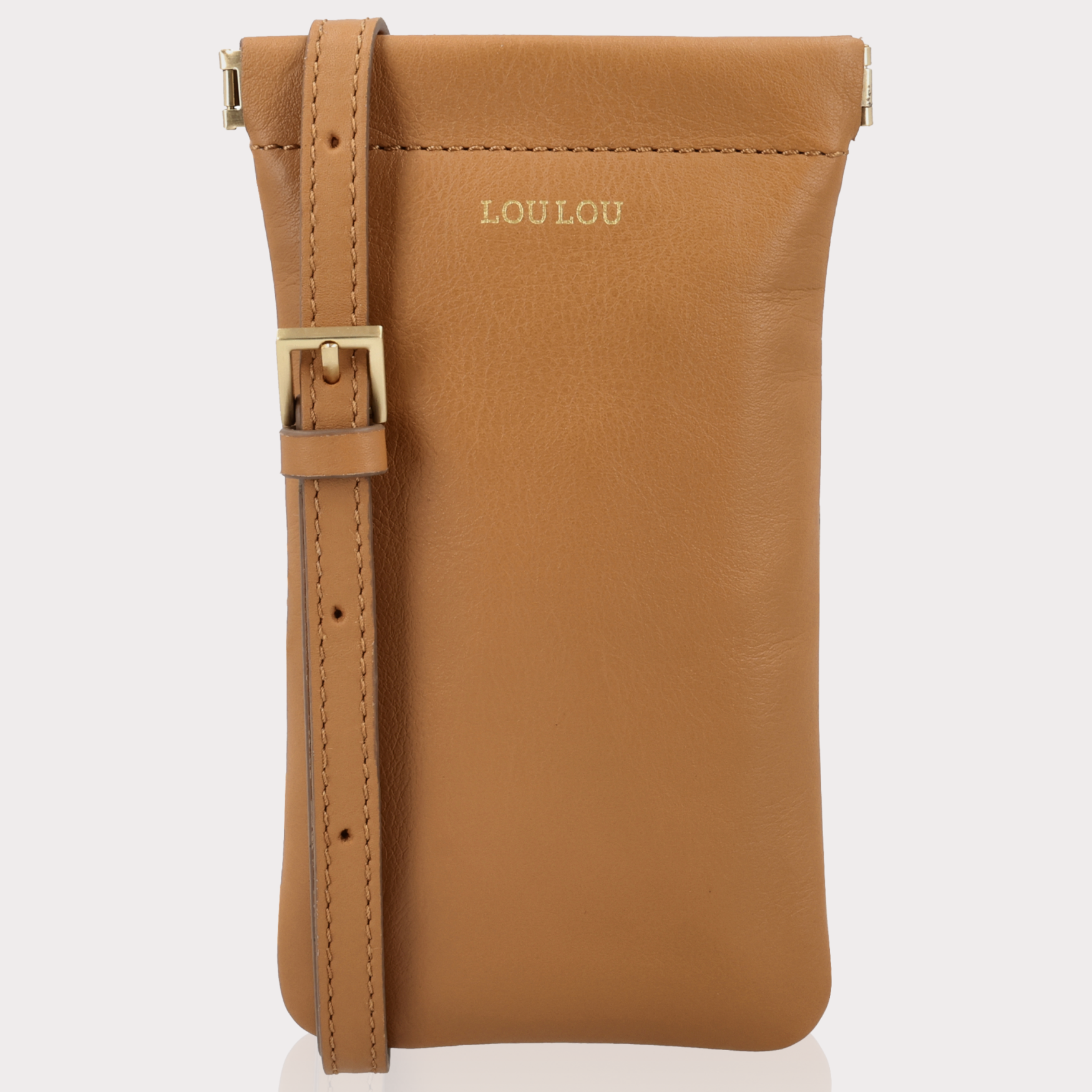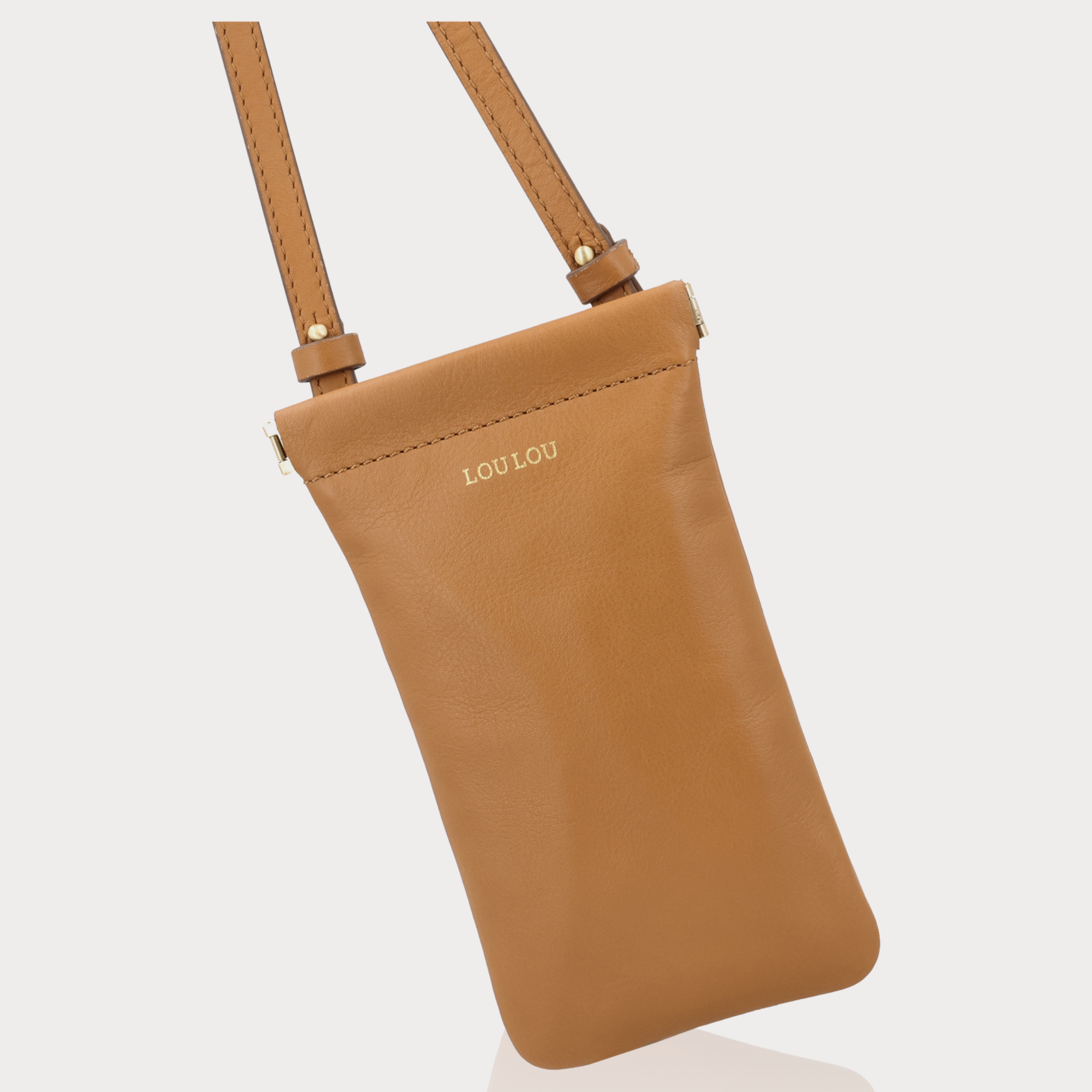 MIA Tan Gold – telefoontasje in cognac leer met knijpsluiting